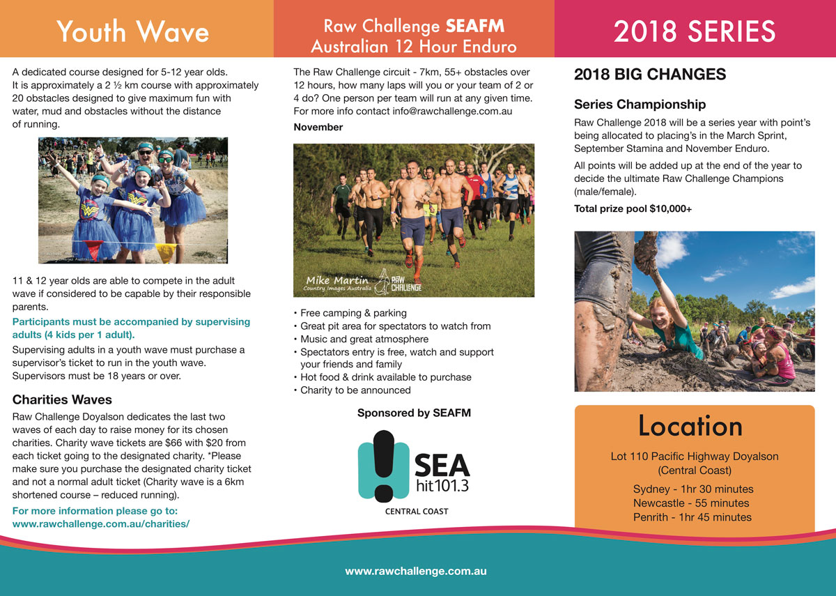 Raw Challenge is a mud obstacle course with 55+ obstacles over a 7km distance. We cater for all ages 5-80, as well as all levels of fitness, from a competitive wave, to a designated women’s wave, to Youth waves catering from 5-12years of age. Raw Challenge is a great way to challenge yourself and your friends both physically and mentally whilst getting down and dirty and having heaps of fun.